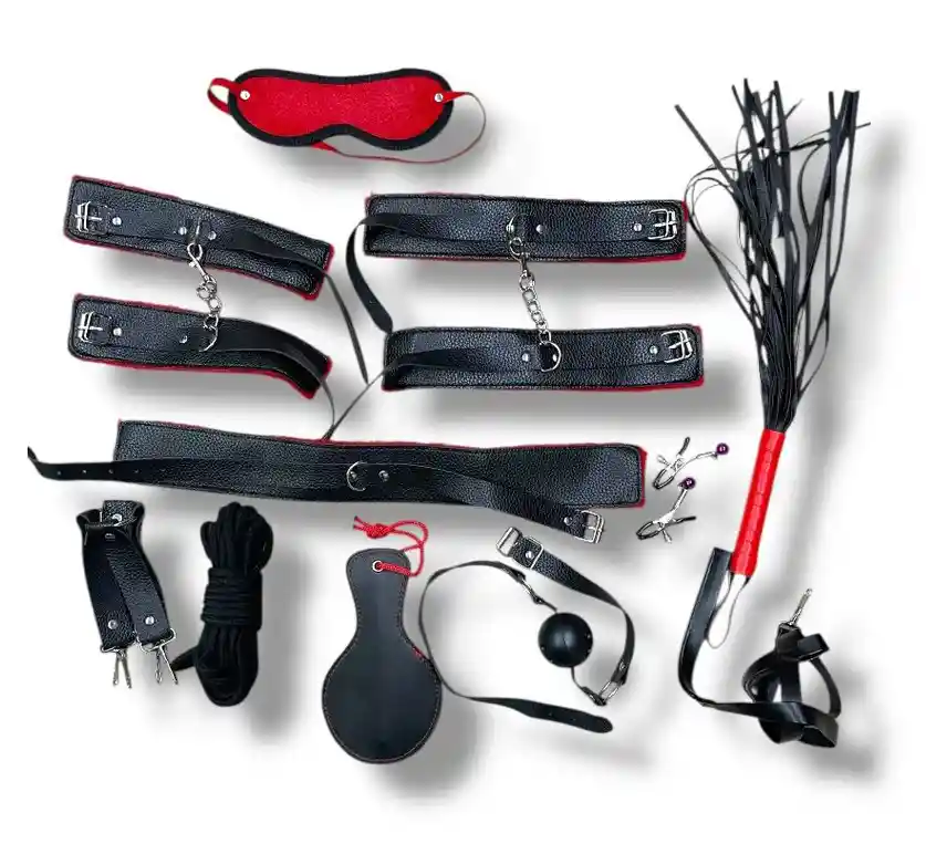 No encontrarás uno más completo. Color NEGRO De imitacion de cuero, los amarres de esposas se pueden modificar a gusto INCLUYE • Esposas para brazos y piernas • Látigo de cuero • Cuerda amarre cuerpo completo • Esposa cuello con amarre y cuerda • Mordaza • Antifaz negro • Pinzas para pezones • Cruz de amarre Cruzada, Para Brazos y Pies • Paleta de Nalgadas