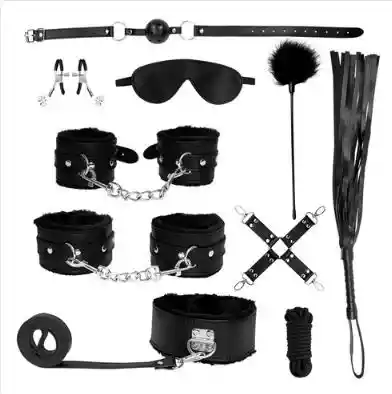 Bondage 10 Piezas Kit de bondage, ideal para los juegos en pareja. Disfruta de nuevas emociones y eleva tu placer al máximo. Catacterísticas: Material: Cuero sintético y metal Color: Negro Largo de esposa para manos: 23 cm Largo de las cadenas: 14,5 cm Largo de esposa para tobillos: 29,5 cm Ancho de las esposa:5 cm Largo mordaza: 62,5 cm Largo collar: 43,5 cm Ancho collar: 5 cm Largo correa: 111 cm Largo látigo: 48,5 cm