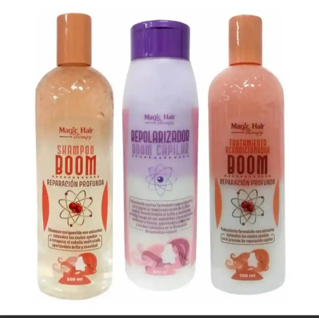 Kit Boom Reparación Magic Hair contiene: Shampoo + Acondicionador Boom Magic Hair 500 ml.: Reparación del cabello maltratado. aportándole brillo y suavidad.Repolarizador Boom Capilar Magic Hair 500 ml. : Reestructuración de la fibra capilar. devolviéndole el brillo y nutrientes perdidos a la hebra capilar luego de ser sometida a tratamientos químicos o físicos.