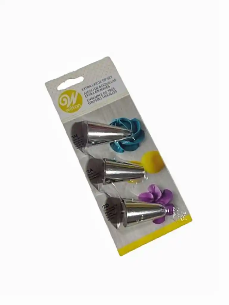Boquillas Wilton x 3. Kit 3 boquillas Wilton, incluye boquilla 1M, 2D y 2A. Material acero inoxidable. Un kit que no puede faltar en tu sitio de trabajo. Ideales para tus decoraciónes de pastelería y repostería.