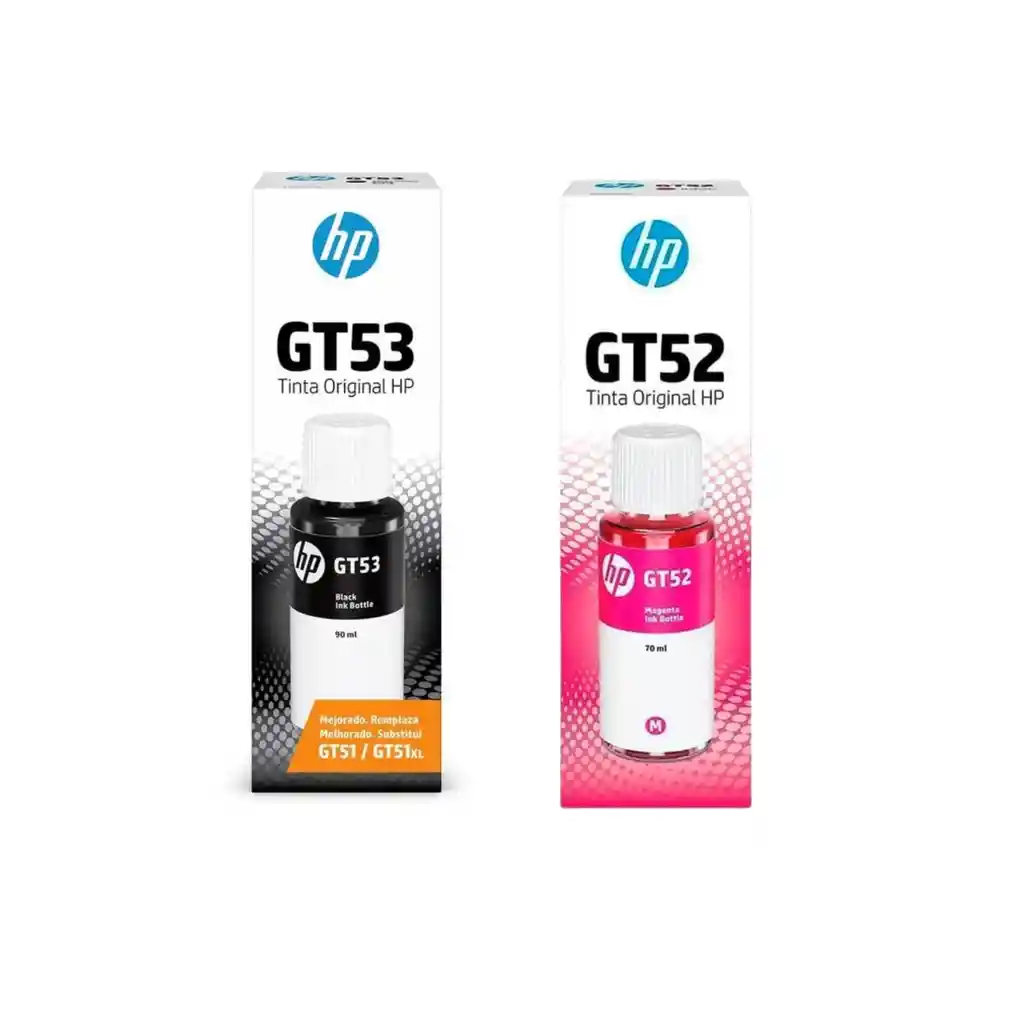 Kit de Botellas de Tinta HP Original GT53 Negro + GT52 Magenta Dale a tus impresiones la calidad que merecen con este combo de tintas originales HP. La botella HP GT53 negra garantiza textos definidos y profesionales, mientras que la HP GT52 magenta aporta un toque de color vibrante y brillante para tus imágenes, gráficos y proyectos a color. Este kit está diseñado para ofrecer recargas fáciles y limpias, alto rendimiento y resultados duraderos en cada impresión.