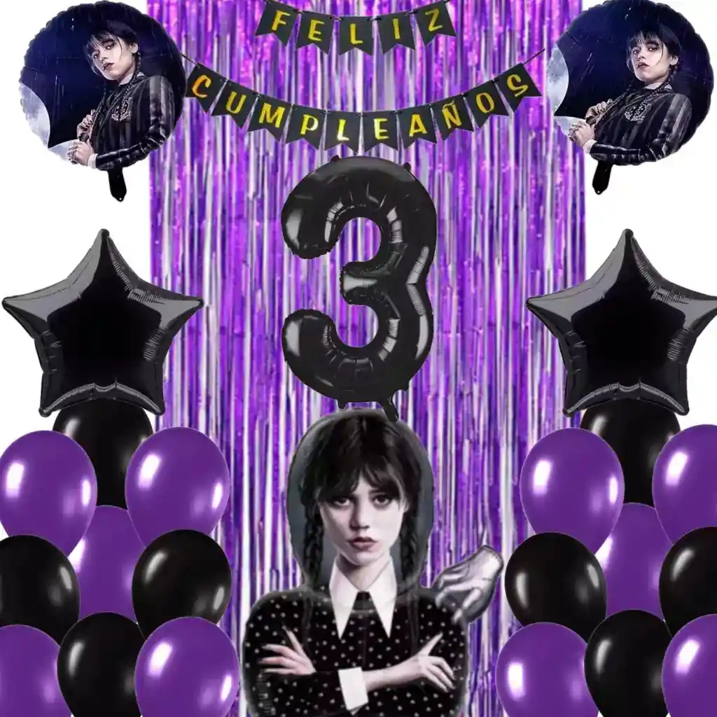 *********************GLOBOS Y PELUCHES MASMELO********************* Somos Mercado Líder Platinum Por tu compra te llevas: 1 Globo número negro 82 cm según tu elección 1 Festón negro 2 metros de largo 2 Globo circular temática de Merlina 45x45cm 1 Globo merlina 65x45cm 2 Globo estrella negro 45x45cm 10 Globo morado 30cm 10 Globo negro 30cm 1 Cortina morada 2x1metros