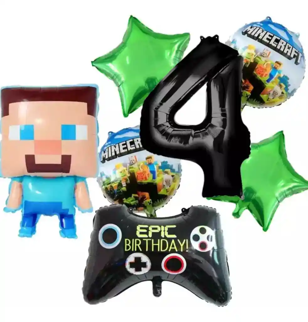 *********************GLOBOS Y PELUCHES MASMELO********************* Somos Mercado Líder Platinum Por tu compra te llevas: 1 Globo muñeco S teve 2 Globo minero temática 45x45cm 2 Globo estrella verde 45x45cm 1 Globo número negro 82 cm según tu elección 1 Globo control de video juego