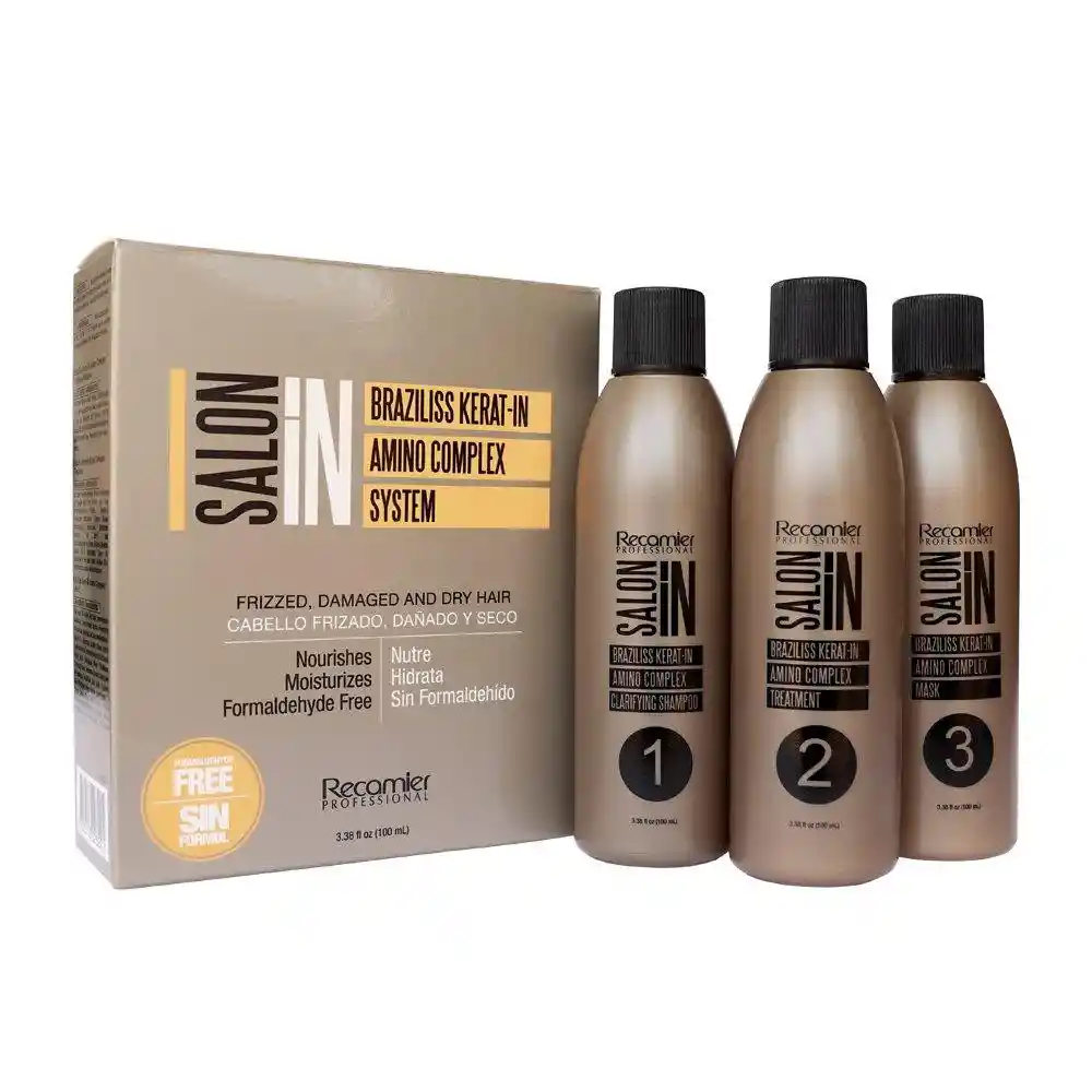 Kit de keratina alisadora completamente sin formol. Vienen 3 productos, cada x100ml. Paso 1 shampoo, Paso 2 keratina y Paso 3 mascarilla. ✅ Paso (1) Shampoo: Limpia profundamente la cutícula del cabello removiendo todos los residuos e impurezas causados por la polución, los tratamientos cosméticos y estilo de vida. Su fórmula libre de sal mantiene la hidratación natural del cabello y la keratina ayuda a reestructurar la fibra capilar desde el inicio del proceso. ✅ Paso (2) Tratamiento: Está especialmente formulado para disminuir el frizz y el volumen en todos los tipos de cabello. Su exclusiva tecnología sin formol y su fórmula con keratina y aminoácidos penetra en la cutícula del cabello dejándola lisa, reparada e hidratada. El cabello se ve y se siente más suave, brillante y lustroso. ✅ Paso (3) Mascarilla: Es un tratamiento reestructurante especialmente formulado con keratina, aminoácidos y aceites naturales para cerrar la cutícula, nutrir e hidratar el cabello luego del uso de Braziliss Kerat-IN Amino Complex Treatment