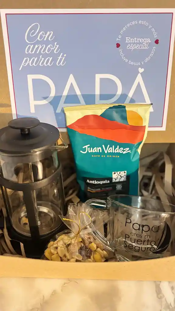Celebra a papá en su día especial o en cualquier ocasión para recordarle cuánto lo amas con esta exclusiva box de regalo. Dentro de esta completa ancheta, encontrarás: 1 Prensa Francesa de Café: Para que prepare su café favorito con el mejor estilo y disfrute de una experiencia gourmet en casa. 1 Café Juan Valdez de Origen: Un café colombiano de alta calidad con notas excepcionales, perfecto para empezar el día con energía. 1 Mug "Papá eres mi Puerto Seguro": Una hermosa taza con diseño de mármol y un barco, ideal para disfrutar de su café mientras le recuerdas tu amor. 1 Bolsa de Frutos Secos o Snack: Un delicioso acompañamiento para su momento cafetero. Esta ancheta es el regalo perfecto para el papá que valora un buen café y los momentos de tranquilidad. Si deseas personalizar tu regalo antes de comprar te recomendamos comunicarte al WhatsApp 3102078219 para ultimar detalles. Para que tu regalo llegue con la tarjeta perfecta y el mensaje ideal, te agradeceríamos especificar el motivo de su obsequio al realizar su pedido (cumpleaños, aniversario, amor, graduación, etc.). ¡Así podremos hacer su detalle aún más especial! 💖 ¡Encuéntralo en @lachimy_barranquilla y haz que su día sea aún más especial!