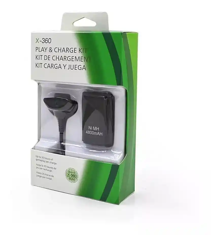 ¡Recarga tu mando inalámbrico de Xbox 360 mientras juegas, sin pilas, batería recargable incluída!. Consigue que la acción no pare con el Kit Carga & Juega Xbox 360e. Recarga mientras juegas o después, aunque tu Xbox esté en modo de espera. Bateria de larga duración gracias a sus 4800 MAH de almacenamiento. Despídete de las pilas desechables y de tener que cambiarlas en mitad de una partida. Siempre listo: carga mientras juegas o cuando la consola está en modo de espera. NOTA IMPORTANTE: ATONOMIA DEL PRODUCTO ES DE 1H A 2H ~ CARACTERISTICAS * Juega y carga al mismo tiempo. * Largo del cable: 1.5M * Necesita tener la batería recargable, de lo contrario, trate su controlador como un controlador con cable si no lo usa con una batería * 100% apto solo para todos los controladores Xbox 360. * Este cable no es adecuado para Xbox One / PC / Laptop / TV o cualquier otro controlador ~ QUE TE INCLUYE * Cable de carga xbox 360 * Bateria de Litio