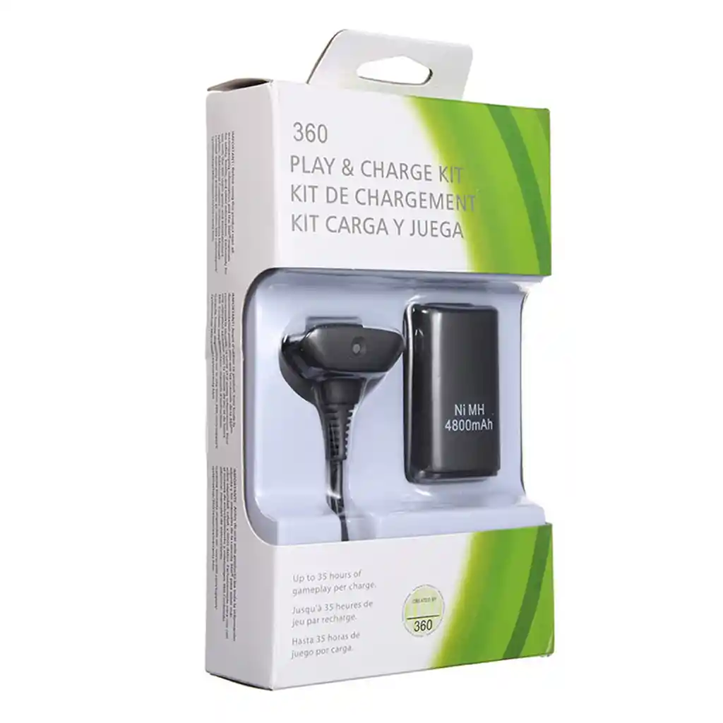 Batería recargable para control de Xbox 360 con cable de carga USB de 1.4m, con duración de hasta 35 horas por carga y la capacidad de 4800mAh. • Tamaño producto: 3.5 x 5.5 x 2 • Tamaño empaque: 11 x 18.5 x 4 • Batería Ni-MH 4800mAh • Marca: 360 • Luz LED indicadora • Longitud del cable: 1.4 metros