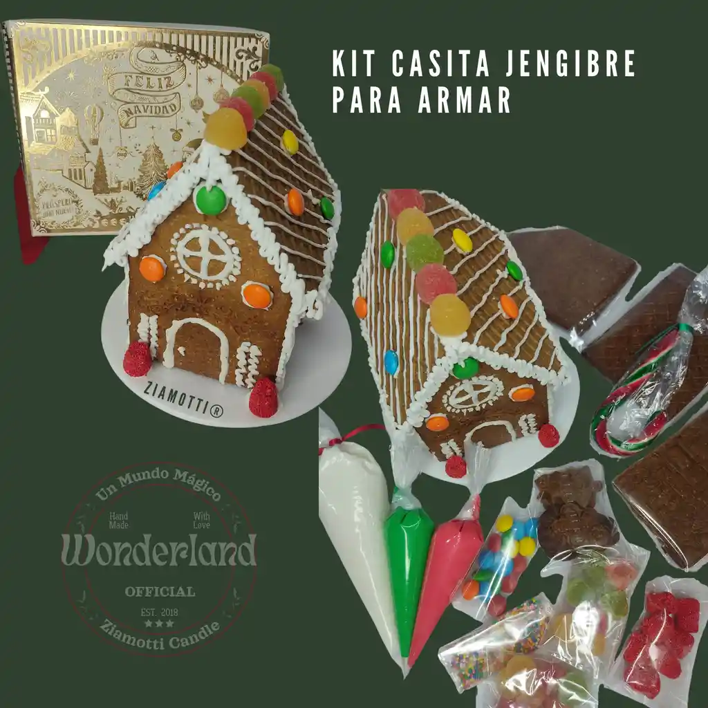 ✨🎄COLECCION WONDERLAND 🎄✨ By Ziamotti No te puedes perder esta MAGICA EXPERIENCIA con nuestra EDICIÓN LIMITADA de CASITA DE JENGIBRE! incluye: 6 piezas de galleta de gengibre para armar estructura de la casa. Dulces variados Manga blanca glaseado. Manga Verde glaseado Manga roja glaseado Caja empaque. Galletas variadas Sorpresa especial Instrucción de armado. Nota: El producto es un kit para armar la casita. No se vende la casita armada. Las imagenes son para visualizacion.