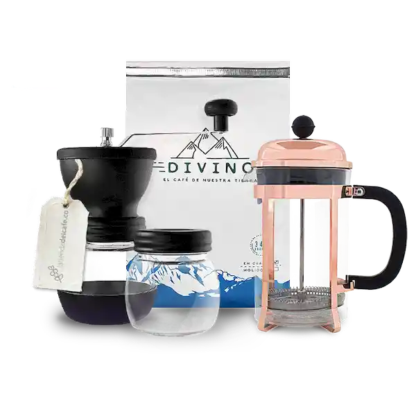 Café de Especialidad de Temporada + Molino Manual de Vidrio Con Doble Recipiente + Prensa Francesa de Bambú de 350 mL. Sin Packaging