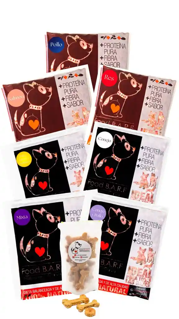 Kit con Galletas (Pollo, mixta, res, conejo, salmón, pollo, salmón y espinacas) 250gr En Food BARF, entendemos que la alimentación de tu perro es clave para su salud y bienestar. Por eso, hemos diseñado nuestros Kits Semanales de Dieta BARF, con recetas variadas que incluyen diferentes proteínas y una combinación equilibrada de ingredientes frescos y naturales. La variedad es fundamental para asegurarte de que tu mascota reciba todos los nutrientes esenciales que necesita para mantenerse saludable, y nosotros te facilitamos todo para que tú solo te preocupes por disfrutar del tiempo con tu perro. ¿Qué incluye nuestros Kits Semanales de Dieta BARF? Cada semana, recibirás un kit completo con porciones frescas y equilibradas de dieta BARF, que incluyen: Proteínas variadas: Para ofrecer a tu perro una fuente diversa de aminoácidos esenciales, ácidos grasos saludables, hierro, zinc y otros nutrientes clave que apoyan la salud muscular, la energía y el bienestar general. Verduras frescas y nutritivas: Llenas de vitaminas, antioxidantes y fibra que promueven una digestión saludable, un sistema inmune fuerte y un pelaje brillante. Vísceras frescas: Corazón, hígado y riñones, que proporcionan nutrientes concentrados esenciales para la función hepática, el sistema digestivo y la salud general de tu perro. Beneficios de nuestros Kits Semanales de Dieta BARF: Variedad para una nutrición completa: La combinación de diferentes fuentes de proteínas, verduras y vísceras en cada semana asegura que tu perro reciba una amplia gama de nutrientes, vitaminas y minerales necesarios para mantener su salud y vitalidad a largo plazo. Comodidad para los dueños: Olvídate de las complicaciones al planificar las comidas de tu mascota. Nuestros kits están diseñados para hacer tu vida más fácil, con porciones ya equilibradas y listas para servir. Solo tienes que abrir el kit y alimentar a tu perro con lo mejor de la naturaleza. Fomento de la salud a largo plazo: La variedad en las proteínas no solo mantiene a tu perro satisfecho, sino que también favorece un desarrollo muscular adecuado, una piel y pelaje saludables, y una digestión óptima. Práctico y sencillo: Variedad necesaria para facilitar la preparación de las comidas de tu mascota. ¡La comodidad y la calidad van de la mano! ¿Por qué elegir los Kits Semanales BARF de Food BARF? Nos enorgullece ofrecer productos de la más alta calidad. Todos nuestros ingredientes son seleccionados cuidadosamente, frescos y locales, para garantizar que tu perro reciba solo lo mejor en cada porción. Nos comprometemos a seguir estrictos estándares de calidad en cada etapa de producción, utilizando métodos seguros y naturales para mantener intactos los nutrientes esenciales en cada receta. ¡Haz que tu perro disfrute de una alimentación variada, balanceada y deliciosa con nuestros Kits Semanales de Dieta BARF y facilita tu rutina diaria mientras cuidas su salud!