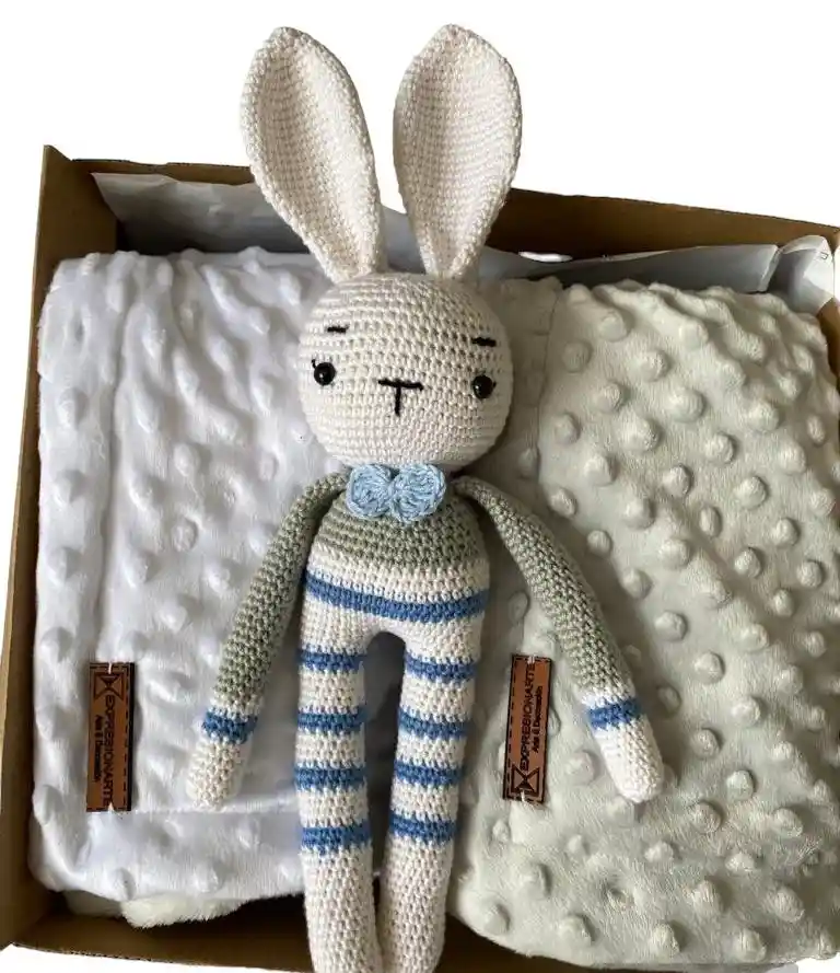 Este Kit incluye pesonaje que mide aproximandamente 30 cm + dos cobijas en tela burbuja doble faz + caja de regalo. Este kit esta cargado de la mejor energía, la que trasmiten las manos de los artesanos que con amor le dan vida, Cual quier variacion es parte de mi esencia unica, todos nuestros productos son hechos a mano en Colombia.