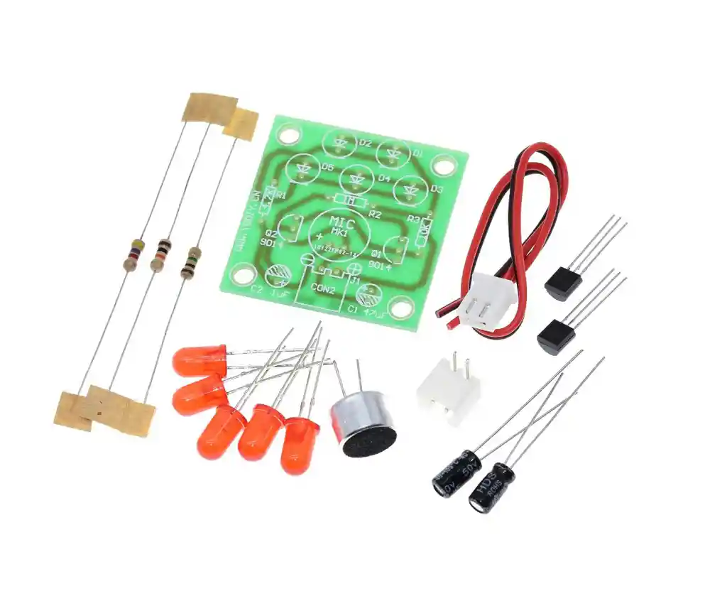 El kit producido después del éxito de cinco LED parpadean con el ritmo de la música u otros sonidos, y se puede colocar en el sonido cerca de las luces para bailarines musicales. Modelo del kit: SKD5 Voltaje de funcionamiento: 3-4,5 V Material de PCB: tablero de fibra de vidrio FR-4 Dimensiones: 34 * 34 MM LA COMPRA INCLUYE: 1X KIT CONTROL LED SONIDO 3V-5.5V PARA ENSAMBLAR