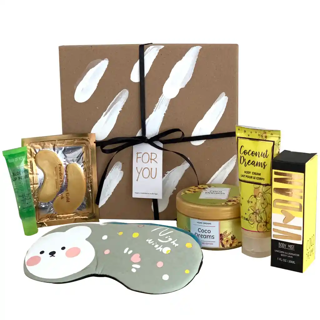 Caja de cuidado corporal: Mantequilla corporal de coco. crema corporal coco 75ml marca Vidan. iluminadora corporal con toques dorados 30ML marca Vidan. Primer para labios con extractos de aloe vera y vitamina e. mascarilla para ojos de colageno y Antifaz con almohadilla en gel para terapia de frio