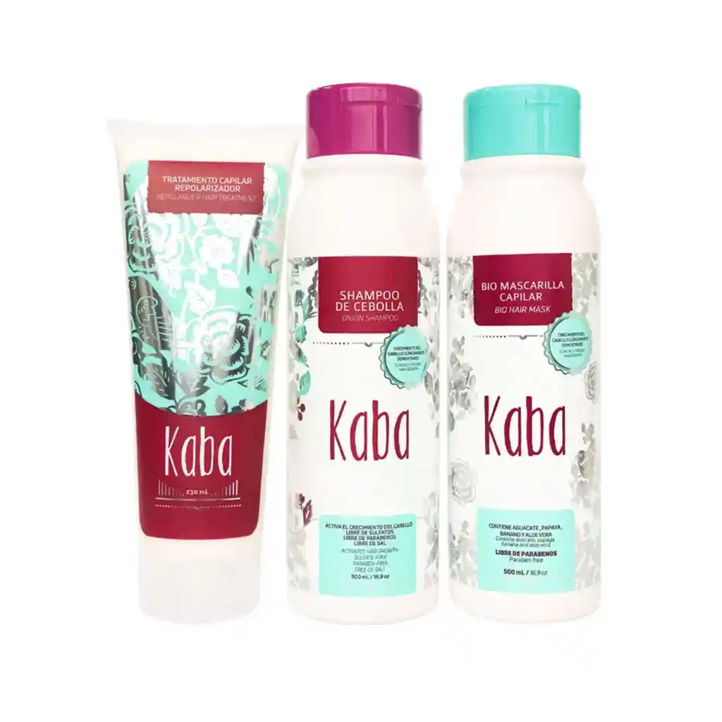 ¡Reparación y crecimiento de tú cabello en un solo kit! Contiene Shampoo de Cebolla, Bio Mascarilla Capilar y Tratamiento Capilar Repolarizador. ¡El crecimiento y la reparación de tu cabello solo la consigues con Kaba! Estos productos te ayudan con el crecimiento y recuperación debido a sus componentes naturales. Disminuyen la caída. Aportan brillo, e hidratación a profundidad al cabello. Al ser a base de productos naturales no afectan la forma natural del cabello. Hidratación a profundidad y control del frizz.