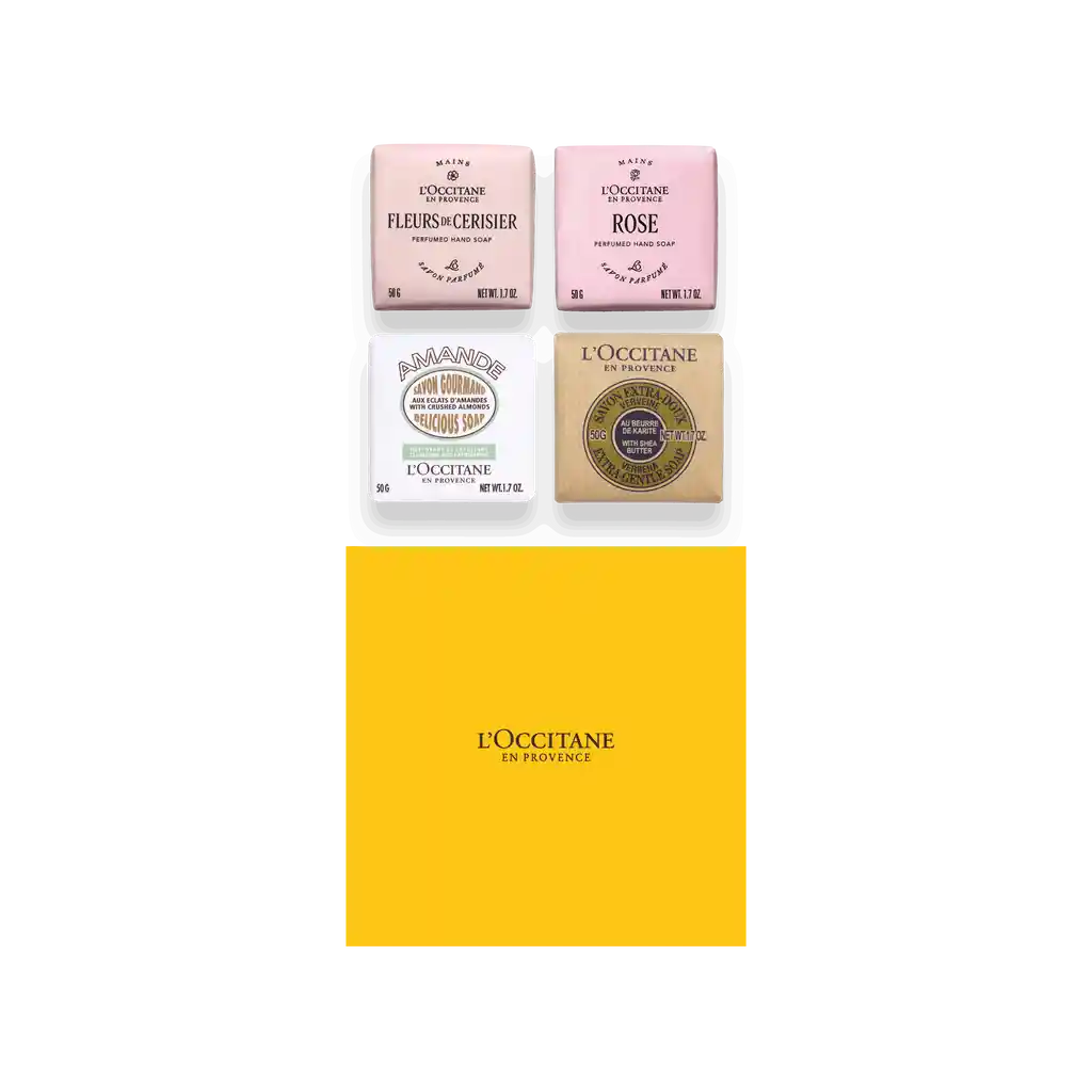 Kit LOccitane Contiene 4 Unidades. Este Kit Contiene: Jabón Sólido Fleurs de Ceresier (Antes Flor de Cerezo) 50 g + Jabón Sólido Rose (Antes Rosa) 50 g + Jabón Exfoliante de Almendras 50 g + Jabón Sólido Karité Verbena 50 g + Cajita Amarilla Loccitane.