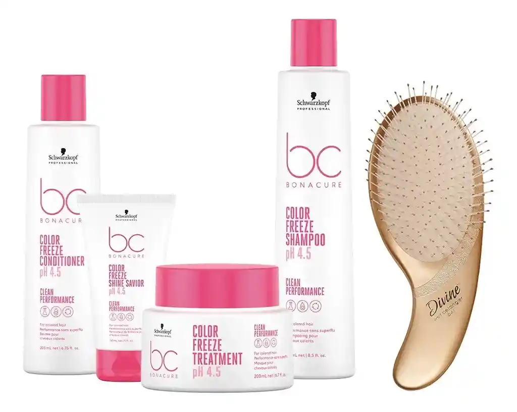Schwarzkopf profesional diseño este kit de cuidado de color profesional, especialmente para ti. ¿Qué incluye este kit? Kit Color Freeze Shampoo 250ml, acondicionador 200ml, tratamiento 200ml, Shine Savior 150ml+ Obsequio Peine OLIVIA GARDEN -Shampoo Color Freeze: Es el encargado de limpiar suavemente tu cabello y al mismo tiempo protege la estructura interna del cabello. -Acondicionador Color Freeze: Es el encargado de devolver el cabello a su nivel de pH óptimo, de revivir los colores apagados y añadir brillo. -Tratamiento Color Freeze: Es el encargado de proporcionar un cuidado profundo, reducir el encrespamiento y suavizar la superficie del cabello. -Shine Savior 150ml: Se encarga de suavizar y fortalecer la estructura del cabello, prolongar el color, añade brillo al cabello y lo protege contra el calor del secador. ¿Cómo se si este es mi kit ideal? - Tienes el cabello tinturado -Con cada lavada el color de tu cabello cambia -Falta de brillo. ¿Cuáles beneficios te brinda de este kit? -Reequilibrar la estructura del cabello a un pH óptimo de 4,5 -Hasta un 90 % de retención del color durante hasta 30 lavados -Te mantiene los tonos fríos y neutraliza los cálidos *Obsequio Olivia Garden* Este exclusivo peine de Olivia Garden es el complemento perfecto para tu rutina de cuidado capilar. Con cerdas flexibles que se adaptan a cualquier tipo de cabello, este peine es capaz de desenredar el cabello sin esfuerzo, incluso cuando está mojado. Su diseño ligero y ergonómico lo hace fácil de llevar a cualquier lugar, asegurando comodidad y funcionalidad en todo momento. Además, previene el quiebre y el daño del cabello, garantizando un cuidado suave y efectivo. Recuerda que nuestros productos son libres de sulfatos y siliconas. Atrévete a darle a tu cabello el cuidado que merece al lado de los mejores productos Somos La Tienda Oficial de Schwarzkopf Profesional, compra tranquilo y seguro