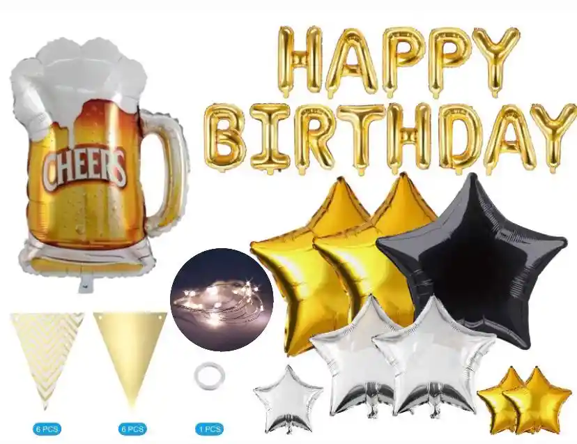 El kit incluye: 2 Estrellas doradas y 1 negra tamaño grande 40x32cm. 2 estrellas plateadas medianas 25x32 cm. Dos estrellas doradas y 1 plateada pequeñas 19x14 cm. 1 globo vaso de cerveza grande 68x49cm. 1 letrero inflable dorado happy birthday, 1 paquete x 12 uds de banderines 6 de un motivo y 6 de otro motivo. 1 luces led que funcionan con dos baterias doble AA. BATERIAS NO INCLIUIDAS. SE ENVIA DESINFLADO, TODAS LAS MEDIDAS FUERON TOMADAS CON LOS GLOBOS DESINFLADOS.