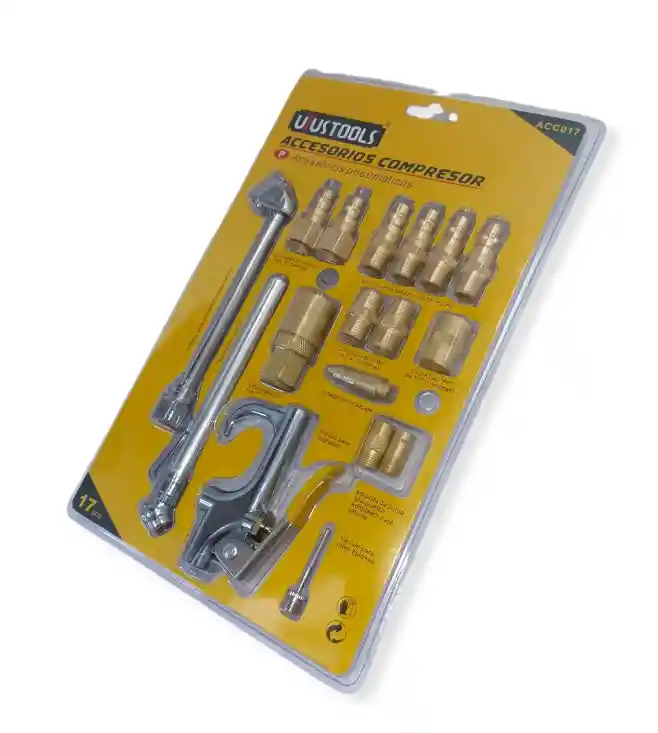 Kit De Accesorios Compresor x 17 pcs CARACTERÍSTICAS • Medida: 1/4" • Inflador Para Neumáticos • Pistola para Aire • Medidor de Presión Profesional • Aguja Para Inflar • Inflador Tipo Espiga • Boquilla de Seguridad • Niple Tipo Macho • Adaptador para Válvula x 2 • Niple Hexagonal x 2 • Acople Macho x 4 • Acople Hembra x 2 • Acople Rápido • UYUSTOOLS