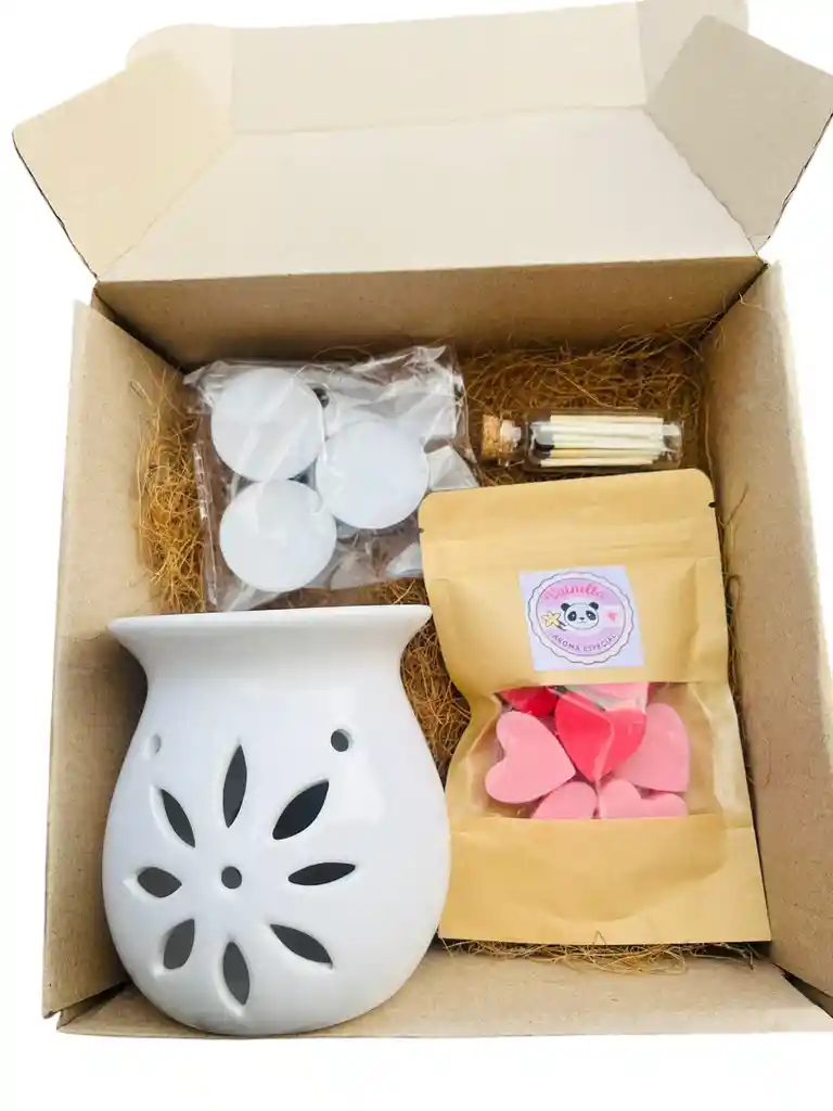 kit de aromatizacion 1 pebetero, 1 bolsa de wax melts de 30 gr (vainilla) , 3 velas de inicio, 1 caja de fosforo personalizada