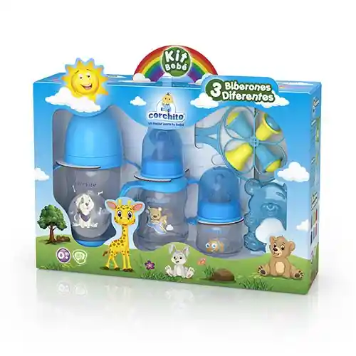 La nutrición es muy importante para el desarrollo del bebe, y dársela con biberones de buena calidad hace que tu bebe se alimente adecuadamente, reduciendo cólicos, vomito y gases. Este Kit Bebe CORCHITO® cuenta con tres biberones para cada una de las etapas de alimentación del bebe. Fabricados en materiales resistentes al impacto y libres de BPA. Diseños ergonómicos de fácil manejo incluso sin manijas, botellas decoradas llamativamente que estimulan el sentido visual del bebe, interior totalmente liso que facilita su limpieza. Biberón Prematuro Botella de tamaño ideal para bebes recién nacidos y prematuros, especial para iniciar los movimientos de succión. Chupo de silicona con tamaño ideal para la pequeña boca de los recién nacidos. Biberón Ocho Botella de práctico tamaño, chupo translúcido elaborado en suave látex cristal no tóxico, material suave y seguro. Disco protector que impide el paso del líquido, mientras no está en uso. Manijas de práctico agarre, ideales para las manos del bebe. Biberón Popocho Botella de mayor capacidad ideal para los bebes de 6 meses de edad en adelante, chupo de silicona con diseño similar al seno, permitiendo una incorporación natural a la alimentación con el biberón. Cuenta con una Boquilla doble flujo que facilita ingerir sustancias espesas promoviendo la transición del biberón al vaso. Manijas de práctico agarre, ideales para las manos del bebe. Adicional cuenta con un Llamadiente Oso que gracias a su superficie suave y texturizada proporciona alivio a las encías calmando las molestias que causan los dientes al salir. También cuenta con un Sonajero con llamativos colores que entretienen al bebé.