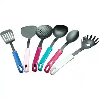 Kit de cucharas plásticas para olla antiadherentes de diferentes medidas, formas y colores.