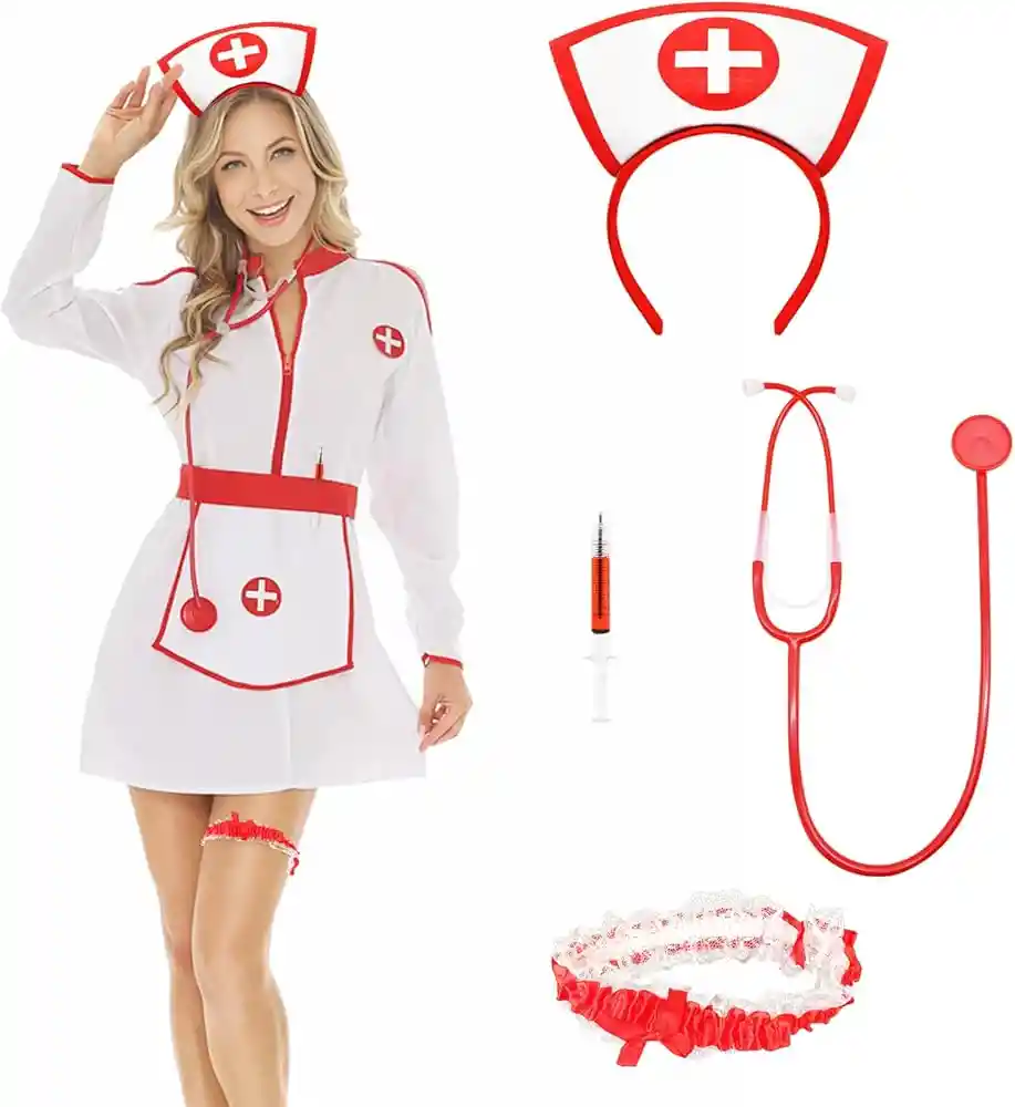 Kit De Disfraz De Enfermería, Lapicero Jeringa, Liguero, Gorro y fonendoscopio - Halloween