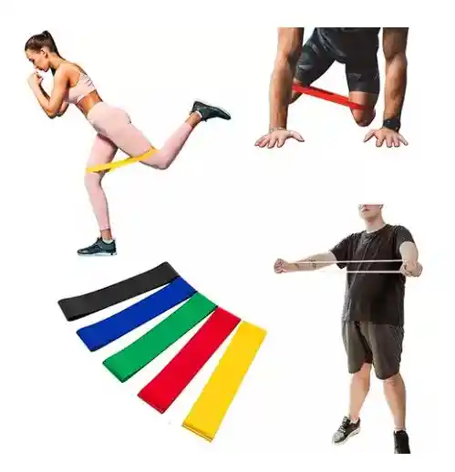 Kit de bandas elásticas de 30 cm con 5 resistencias diferentes Las bandas vienen marcadas con la resistencia Verde 10-15lbs Azul 20-25lbs Amarillo 30-35lbs Rojo 35-40lbs Negro 45-50lbs