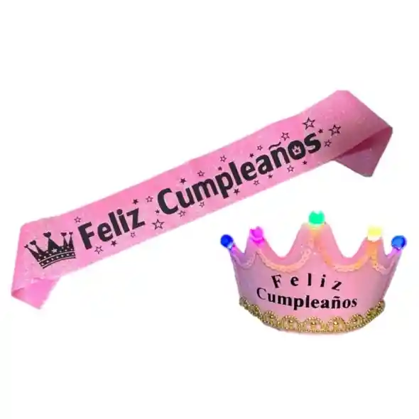 Kit para cumpleaños Rosado corona con luz led - incluye baterias banda escarchada dorada FELIZ CUMPLEÑOS disponible para envio inemdiato