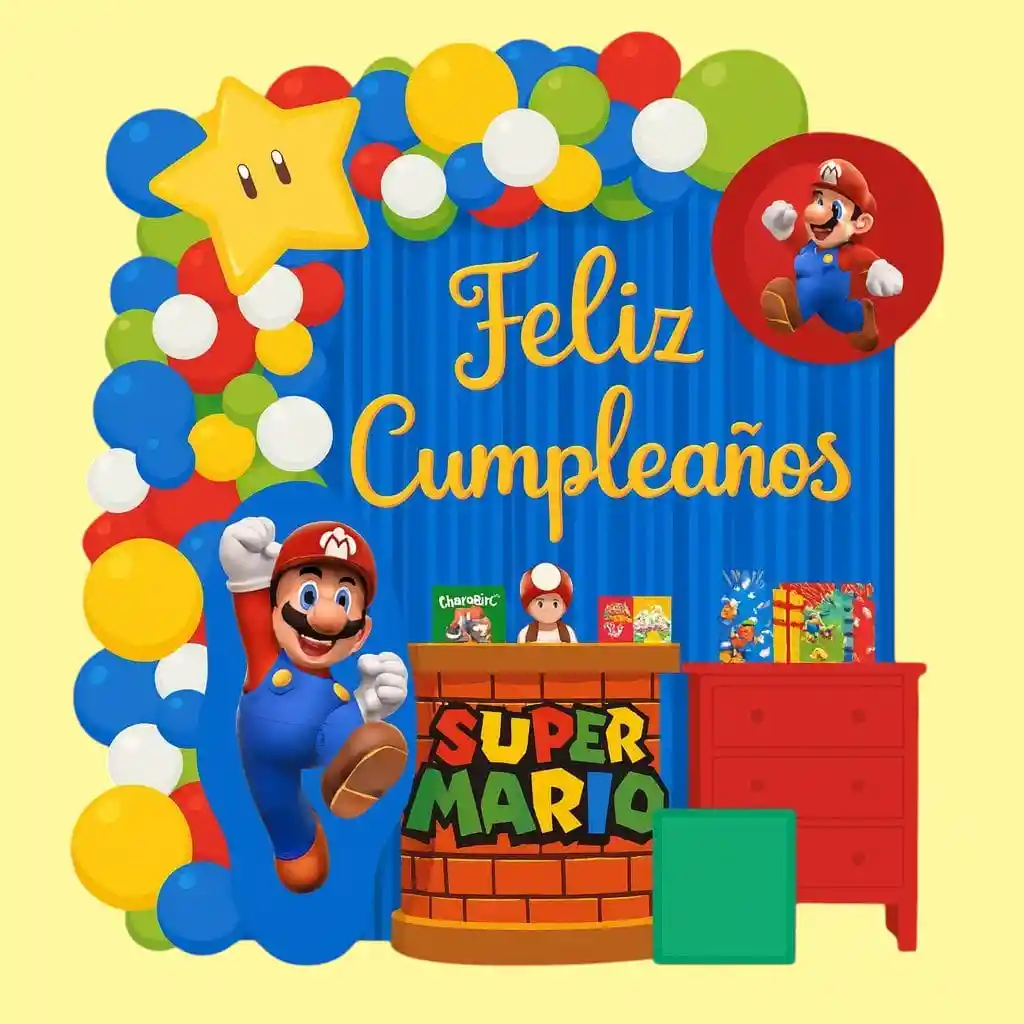 Kit de Fiesta Mario Bros X75 Piezas Decoración Cumpleaños Infantil Descripción: Convierte la celebración en una gran aventura con este Kit de Fiesta Mario Bros de 75 unidades. Incluye decoraciones coloridas y temáticas inspiradas en el mundo de Mario para crear un ambiente divertido y lleno de magia. Perfecto para cumpleaños infantiles, este set aporta todo lo necesario para sorprender a los pequeños fans de Super Mario y sus amigos. * Diseño llamativo con Mario y personajes clásicos * 75 piezas fáciles de armar e instalar * Ideal para fiestas de niños, reuniones familiares y temáticas gamer •Crea un ambiente alegre, lleno de color y diversión Con este kit tu fiesta será inolvidable, ¡los niños se sentirán dentro del mundo de Super Mario! El kit incluye: •1 Cortina Azul •3 Globo Feliz Cumpleaños Dorado •1 Globo Mario Bros metalizado 55x45cm •1 Globo Redondo Metalizado 45x45cm •1 Globo Estrella Metalizado 45x45cm •26 Globos Látex Colores Surtidos 5" pulgadas •40 Globos Látex Colores Surtidos de 10" Pulgadas •1 Cinta •1 Sticker circulares TENER EN CUENTA: •LOS GLOBOS VIENEN DESINFLADOS •“SOLO VIENE LO ESPECIFICADO EN LA DESCRIPCIÓN. IMAGENES ADICIONALES SON SOLO PARA AMBIENTACIÓN.”