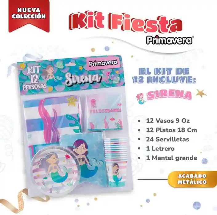 Kit De Fiesta Sirena Marca Primavera Este kit consta de: - 12 Vasos de 9 Oz - 12 Platos de 18 Cm - 24 Servilletas - 1 Letrero - 1 Mantel grande de la tematica seleccionada