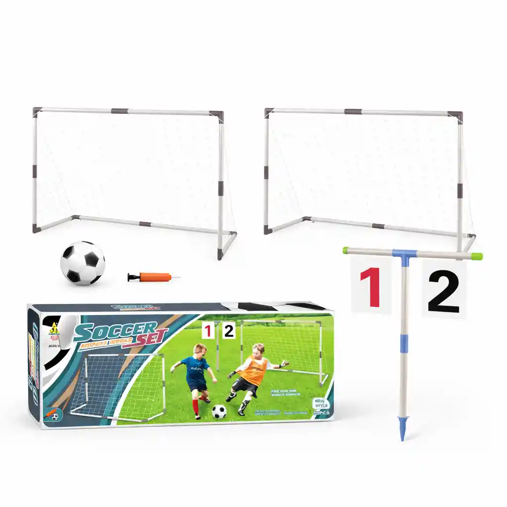 kit de deporte portátil diseñado para niños que permite configurar dos porterías individuales o un arco de mayor tamaño. Dimensiones de los Arcos: Cada arco individual tiene una medida aproximada de 110 cm de ancho x 80 cm de alto. Algunos modelos similares en configuración 2 en 1 pueden ofrecer un tamaño combinado de hasta 120 cm x 80 cm. Material: Estructura fabricada en PVC resistente o plástico de alta durabilidad, diseñada para ser liviana y segura para uso infantil. Portabilidad: Es un sistema armable y desarmable que no requiere herramientas complejas, lo que facilita su transporte para juegos en jardines, parques o interiores. Contenido del Set El paquete estándar incluye los siguientes elementos: 2 Porterías: Estructuras de plástico con sus respectivas mallas integradas. 1 Balón: Generalmente una pelota de PVC o goma pequeña (tamaño #1), adecuada para niños. 1 Inflador: Bomba manual con aguja para el balón. Marcador de puntaje: El set incluye un poste con tarjetas numeradas para llevar el registro de los goles