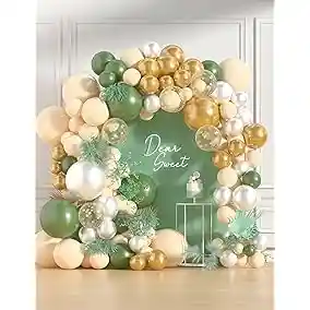 kit de globos que consta de 153 piezas, globos de color dorado, blanco, rubor, confeti y verde, cadena para unir los globos y cinta. Globos con medidas de 5 Pulgadas, 10 Pulgadas, 12 Pulgadas y 18 Pulgadas.