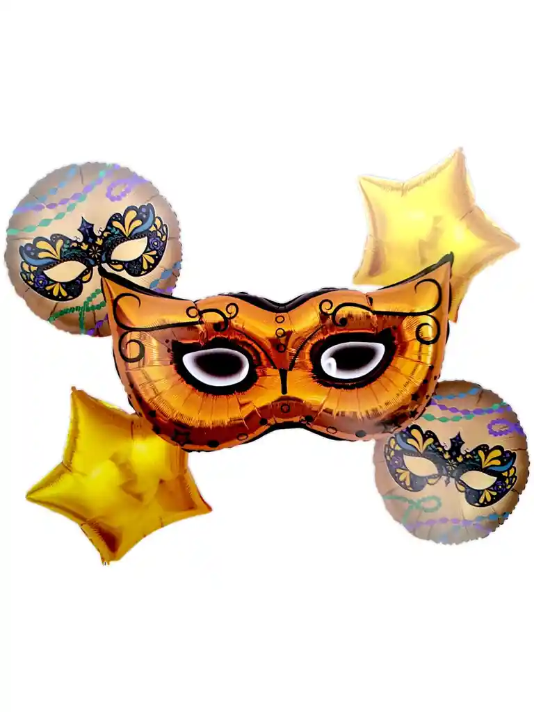kit de Globos para decoración de fiesta carnaval de barranquilla Material: Papel de aluminio Color: dorado Tamaño de la máscara: 50 cm x 30 cm Tamaño de los globos: 45 cm de diámetro incluye 2 estrellas doradas y 2 globos redondos los globos se envian sin inflar si deseas algo adicional indicanos y con gusto te colaboramos