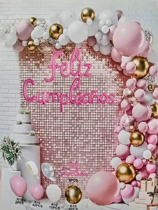 Por tu Compra llevas: •42 Globos R10 Rosado •15 Globos R10 Blanco •6 Globos R10 Dorado •2 Globos R18 Rosado •2 Cintas Especiales para Arco •3 Piezas Globo Metalizado Feliz Cumpleaños Fucsia