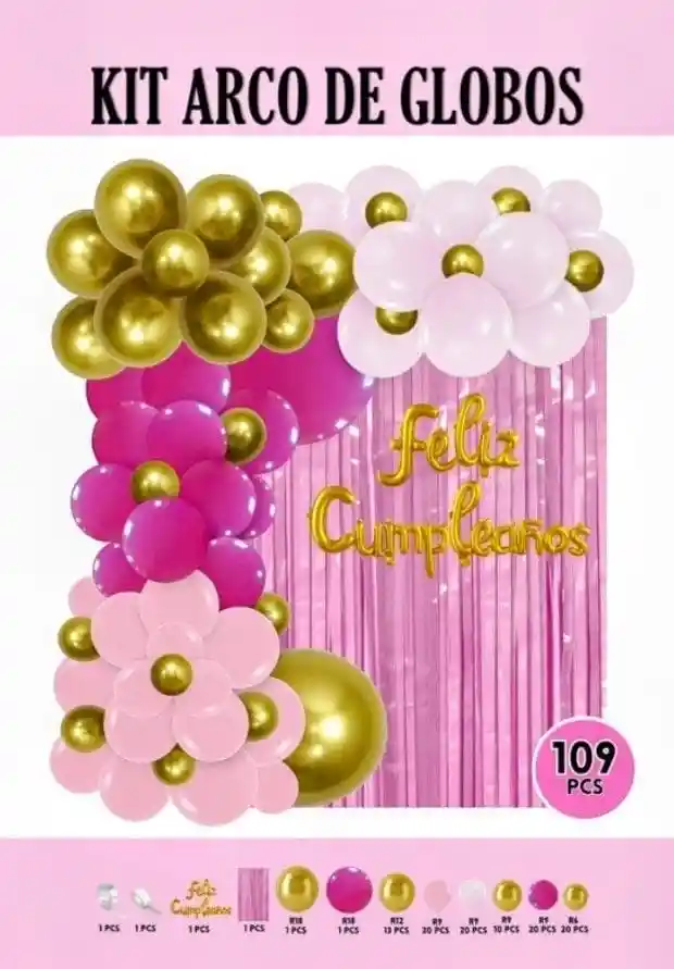 Por tu Compra llevas 109 Piezas: •15 Globos R6 Blanco •15 Globos R6 Rosado •15 Globos R6 Oro Rosa •16 Globos R9 Blanco •16 Globos R9 Rosado •16 Globos R9 Oro Rosa •10 Globos R18 Globos Transparente Confeti Fucsia •1 Globo R18 Blanco •1 Globo R18 Rosdo •2 Cintas Especiales para Arco 1 Cortina Rosada de Flecos 1 Pieza Globo Metalizado Feliz Cumpleaños Plateado