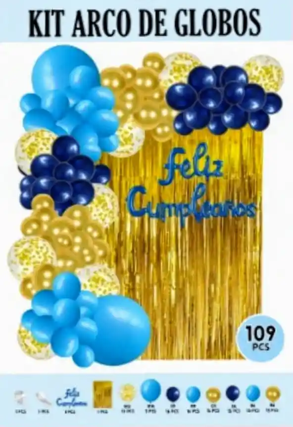Por tu Compra llevas 109 Piezas: •15 Globos R6 Dorado •15 Globos R6 Azul •15 Globos R6 Azul Rey •16 Globos R9 Dorado •16 Globos R9 Azul Claro •16 Globos R9 Azul Rey •10 Globos R12 Transparente + Confeti Dorado 2 Globos R18 Azul 2 Cintas Especiales para Arco 1 Cortina Dorada de Flecos 1 Pieza Globo Metalizado Feliz Cumpleaños Azul