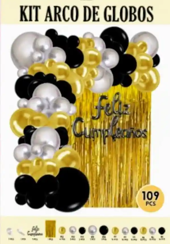 Por tu Compra llevas 109 Piezas: •15 Globos R6 Negro •15 Globos R6 Plateado •15 Globos R6 Dorado •16 Globos R9 Negro •16 Globos R9 Plateado •16 Globos R9 Dorado •3. Globos R12 Negro •3. Globos R12 Plateado •4 Globos R12. Dorado 1 Globo R18 Negro 1 Globo R18 Plateado 2 Cintas Especiales para Arco 1 Cortina dorado de Flecos 1 Pieza Globo Metalizado Feliz Cumpleaños negro