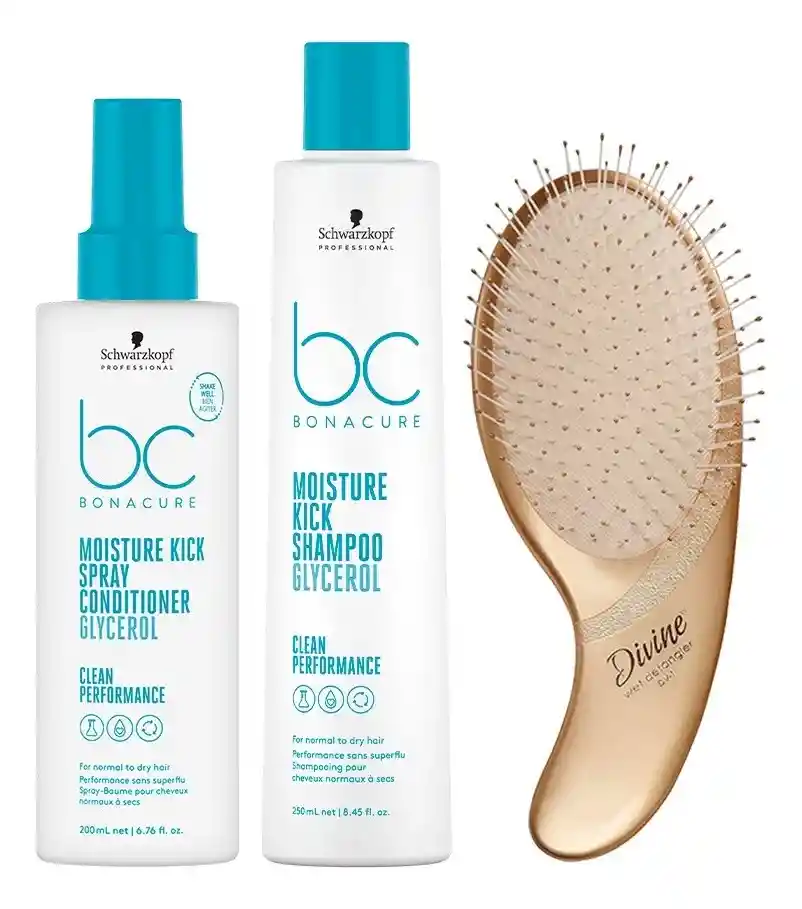 Schwarzkopf profesional diseño este kit de hidratación profesional, especialmente para ti. ¿Qué incluye este kit? Kit Moisture Kick incluye tratamiento 200ml, shampoo 250ml + Obsequio Peine OLIVIA GARDEN -Tratamiento Moisture Kick de 200ml: que es el encargado de brindar un cuidado profundo y una sensación de cabello humectado a tu cabello, y además de eso añade un brillo de aspecto saludable. -Shampoo Moisture Kick de 250ml: Encargado de limpiar suavemente el cabello y además de eso, este shampoo ayuda a prevenir la deshidratación. ¿Cómo se si este es mi kit ideal? - Sientes que tu cabello está seco -Se te cae mucho el cabello cuando lo estas cepillando -Acabas de llegar de piscina, mar y sientes que tu pelo esta deshidratado -Falta de brillo. ¿Cuáles beneficios te brinda de este kit? -Limpia e hidrata tu cabello a profundidad -Hasta 48 horas de sensación de cabello humectado -Más elasticidad -Hasta un 72 %* de mayor manejabilidad. *Obsequio Olivia Garden* Este exclusivo peine de Olivia Garden es el complemento perfecto para tu rutina de cuidado capilar. Con cerdas flexibles que se adaptan a cualquier tipo de cabello, este peine es capaz de desenredar el cabello sin esfuerzo, incluso cuando está mojado. Su diseño ligero y ergonómico lo hace fácil de llevar a cualquier lugar, asegurando comodidad y funcionalidad en todo momento. Además, previene el quiebre y el daño del cabello, garantizando un cuidado suave y efectivo. Recuerda que nuestros productos son libres de sulfatos y siliconas. Atrévete a darle a tu cabello el cuidado que merece al lado de los mejores productos. Somos La Tienda Oficial de Schwarzkopf Profesional, compra tranquilo y seguro