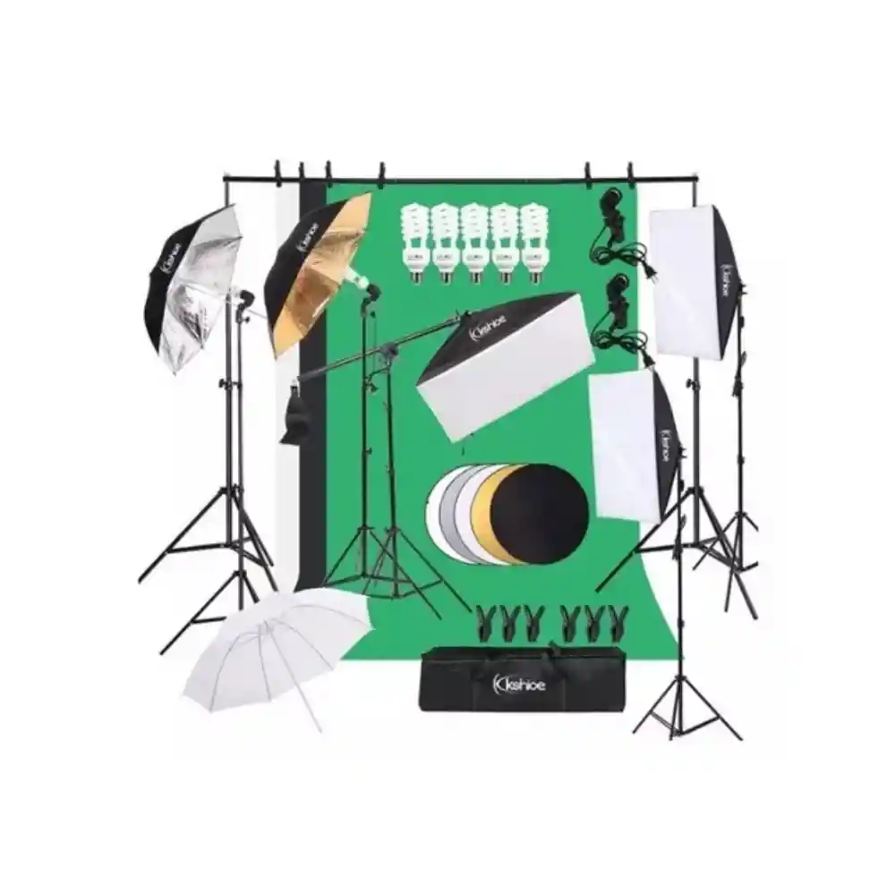 El kit incluye: 5 soportes de luz de 2 metros; 2 soportes de luz de una cabeza; 5 focos de iluminación de luz diurna CFL de 45 W; 3 sombrillas de 84 cm; 3 Softbox de 50 x 70 cm; 1 telón de fondo de 1.6 x 2.74 metros (en negro, blanco y verde); 6 pinzas para telófondo; 1 sistema de apoyo para fondo de 2 x 3 metros; 1 bolsa de transporte para sistema de apoyo de fondo; 1 bolsa de transporte para kit de iluminación; 1 Reflector de estudio 5 en 1. 3 softbox de 50 x 70 cm. Softbox difunde la luz y te da una iluminación uniforme perfecta cuando necesitas las mejores tomas posibles. Soporte de lámpara ajustable de 210°, satisface tus diferentes necesidades de toma de fotografías. (1) Reflector de estudio plegable 5 en 1: incluye 5 reflectores diferentes (plata, oro, blanco, negro y tela translúcida); viene con una práctica bolsa de transporte; fácil de llevar y almacenar.