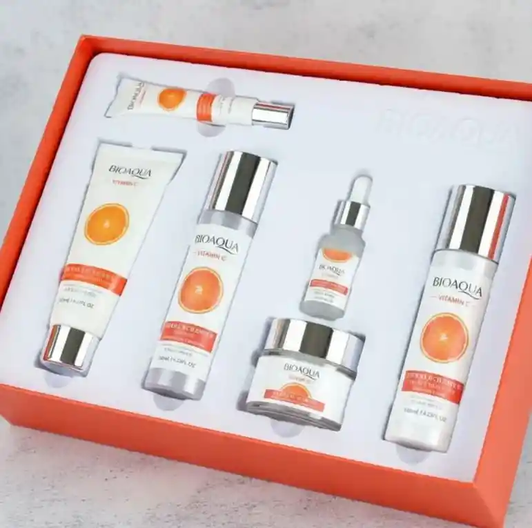 KIT VITAMINA C BIOAQUA ESTUCHE DE LUJO Contiene: - Jabon facil 100ml. Limpieza profunda e hidratante. - Tonico Hidratante 120ml. Refresca y equilibra la piel. - Suero Hidratante 15ml. Concentrado antioxidante. - Crema Facial 50gr. Nutricion intensiva y proteccion. - Contorno de ojos 20gr. Reduce ojeras y lineas de expresion. Beneficios: - Previene y aclara manchas con su accion antioxidante. - Hidrata y revitaliza, mejorando la textura de la piel. - Protege contra el envejecimiento prematuro y radicales libres. Deja la piel mas firme, luminosa y saludable. Modo de aplicacion: Jabon - Tonico - Suero - Locion - Crema - Contorno de ojos