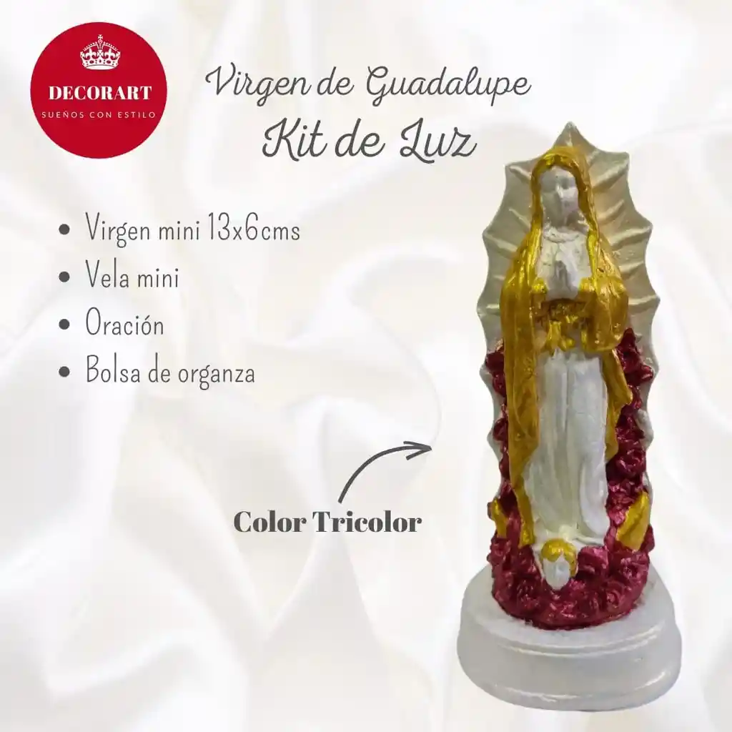 Kit de luz contiene una imagen de la virgen de Guadalupe de 13cms de alto, vela mini y bolsa de organza blanca, azul o rosa. Un detalle para iluminar la vida de todas esas personas importantes en tu vida.