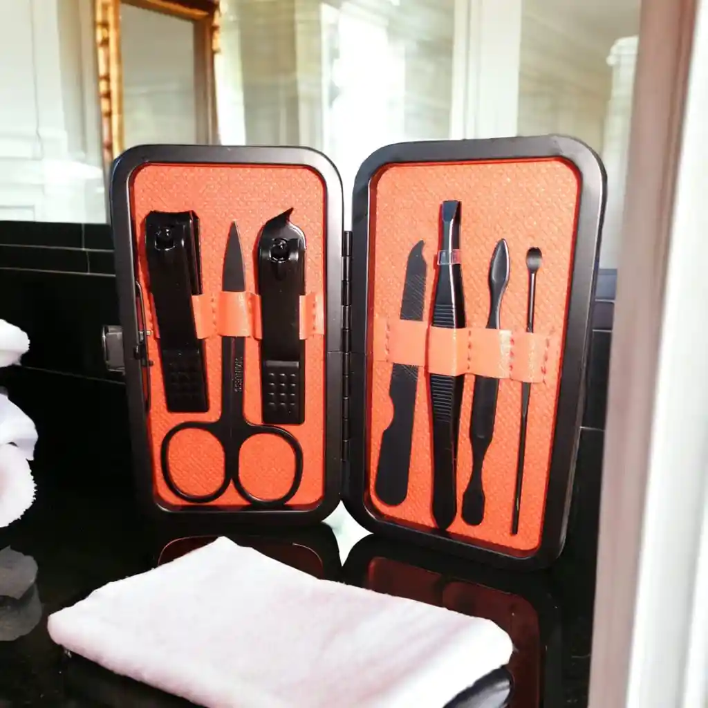 Todas las piezas están hechas de acero inoxidable de alta calidad y han sido pulidas y endurecidas repetidamente, son fuertes y duraderas. Son brillantes y no se oxidan, lo que reduce el riesgo de infección. Set de manicura y pedicura de 7 piezas: el set de manicura y pedicura incluye 1 cortaúñas mediano, 1 cortaúñas con borde en ángulo, 1 lima de uñas, 1 palillo de uñas de doble cabeza, 1 tijera para cejas, 1 palillo para orejas, 1 pinza para cejas. Fácil de transportar: El juego de cortaúñas de 7 piezas está equipado con un elegante y estilizado estuche de PU, puede proteger herramientas afiladas y es fácil de transportar. Ideal para viajar o para estar en casa.