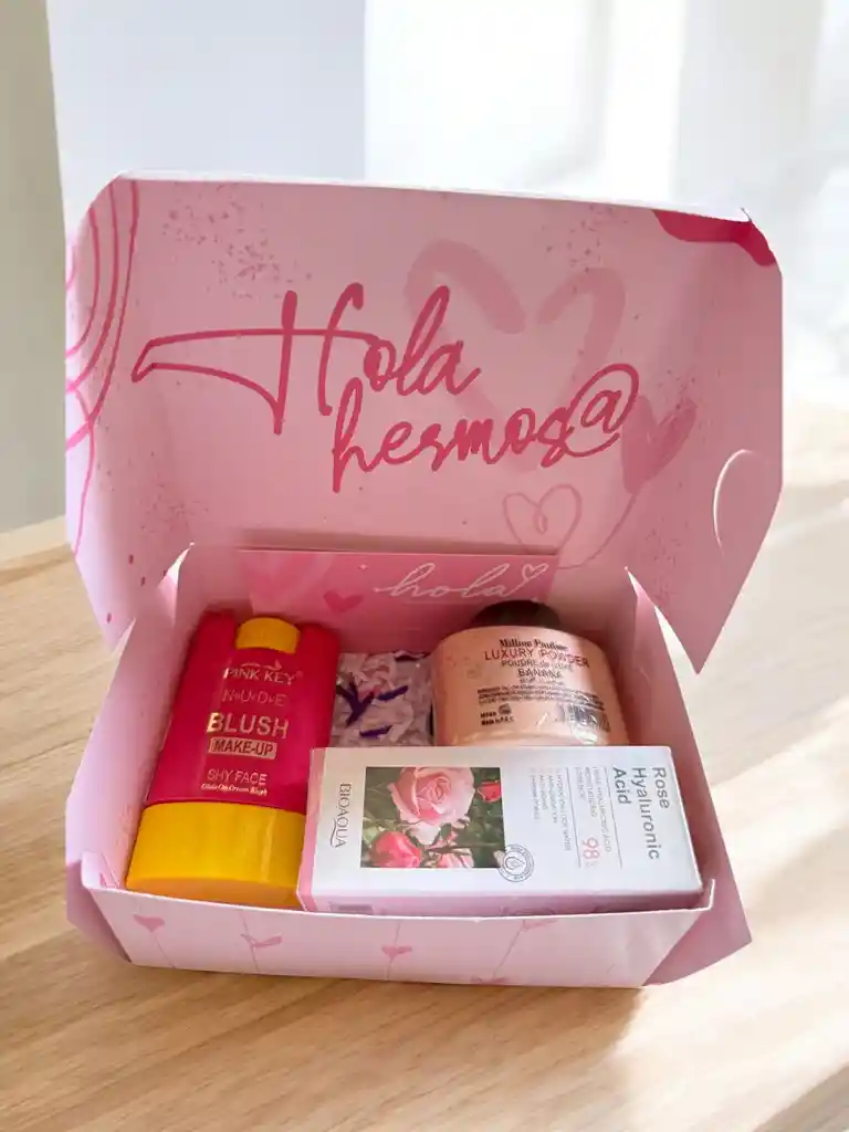 Rubor en barra, polvo con color, serum acido hialuronico y rosas. Presentación caja de regalo.