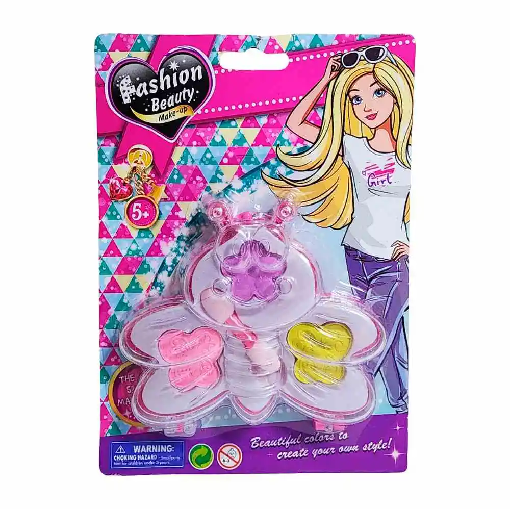 El set de maquillaje infantil Fashion Beauty en estuche con forma de mariposa ofrece colores brillantes y divertidos para que las niñas a partir de 5 años puedan crear su propio estilo, jugar a ser grandes artistas y disfrutar de un look lleno de fantasía, siendo un accesorio perfecto para juegos de imitación y momentos de creatividad segura y entretenida. Ficha Técnica: Dimensiones del empaque : 17 cm x 12 cm x 2 cm Material : ABS Edad recomendada + 5 Años Certificado de conformidad: SL-CS-2100440 Referencia: C4604 ** _Para defectos de fábrica o retractos: \_Por favor revise el producto apenas lo reciba y antes de usarlo. No aplican ley de retracto o defectos de fábrica luego de usar el producto. Se manejan máximo 5 días para reportar defectos de fábrica (por ejemplo, producto funciona mal, piezas faltantes, rotas, etc). Para hacer efectiva la devolución el producto debe devolverse con el empaque original, el cual debe estar en buen estado, incluir todos los documentos y las partes completas y sin daños.