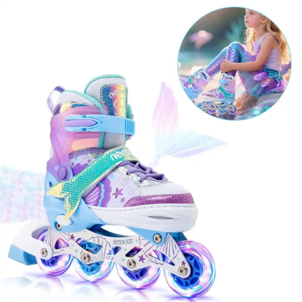 *** SOMOS RAVESTORE ONLINE **** Nota: Disponible solo en color ROSADO ¡Conviértete en una Sirena! ¿Tu hijo sueña con ser una sirena? ¡Tenemos la solución perfecta! Presentamos nuestros patines en línea ajustables, diseñados especialmente para que tu pequeña brille como una sirena en tierra. Características Destacadas: • Ajustable en 4 tamaños: Sin preocupaciones por el crecimiento de los pies. Estos patines se adaptan a su tamaño, ¡acompañándola durante años de diversión! • Ruedas iluminadas: Las llamativas ruedas brillantes harán que cada paseo sea una aventura mágica, incluso por la noche. ¡La diversión nunca se detiene! • Calidad garantizada: Con décadas de experiencia en la fabricación de patines, te aseguramos que este par es ideal para tu hijo. Prometemos un patinaje divertido y seguro. Regalo Perfecto ¡No busques más! Estos bonitos patines son el regalo ideal para cumpleaños, perfectos para niñas de 5 a 12 años. Dale a tu hijo la oportunidad de disfrutar del patinaje como un emocionante pasatiempo a largo plazo. ¡Haz tu compra ahora y deja que la magia comience! ¡Compra lo mejor, compra con RaveStore Online!
