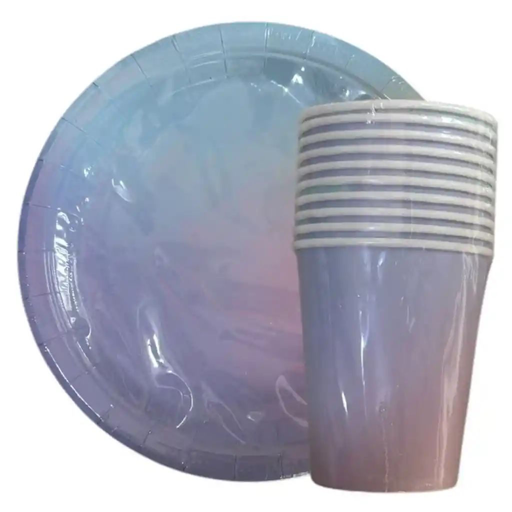 Kit de Platos y Vasos Azul-Morado — incluye 10 platos y 10 vasos del mismo color. Perfecto para fiestas, reuniones y eventos. Resistente, práctico y listo para usar en cualquier ocasión." Incluye 10 platos + 10 vasos. Material resistente y ligero. Ideal para reuniones, cumpleaños y celebraciones. Fácil de transportar y usar.