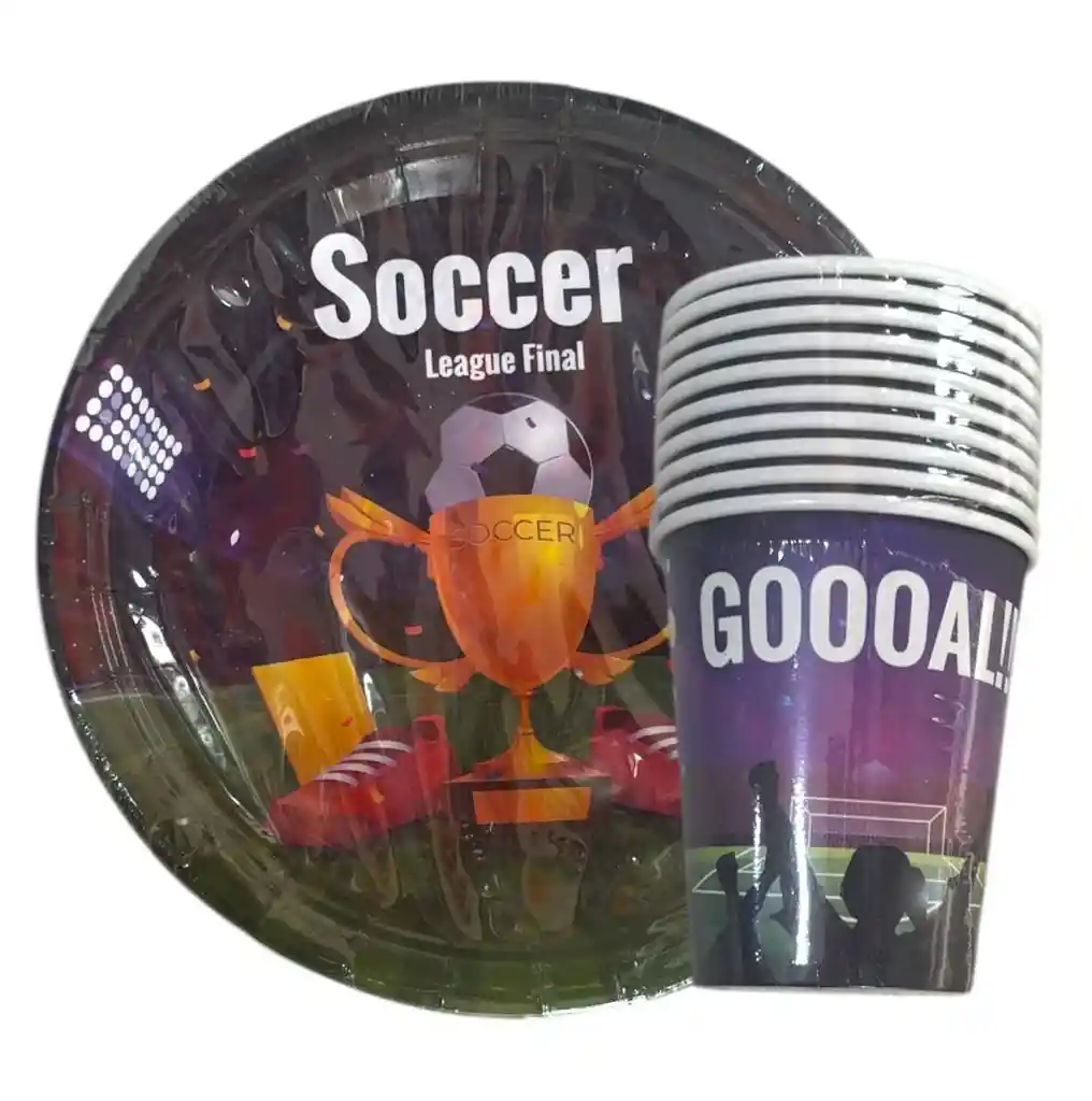 Kit de platos y vasos de fútbol — incluye 10 platos y 10 vasos con diseños deportivos. Perfecto para fiestas infantiles, celebraciones futboleras y cumpleaños llenos de energía Incluye 10 platos + 10 vasos con temática de fútbol. Diseños con balones, canchas y colores deportivos. Ideal para cumpleaños, torneos y fiestas temáticas. Material resistente y práctico. Aporta un ambiente festivo y deportivo a la mesa.