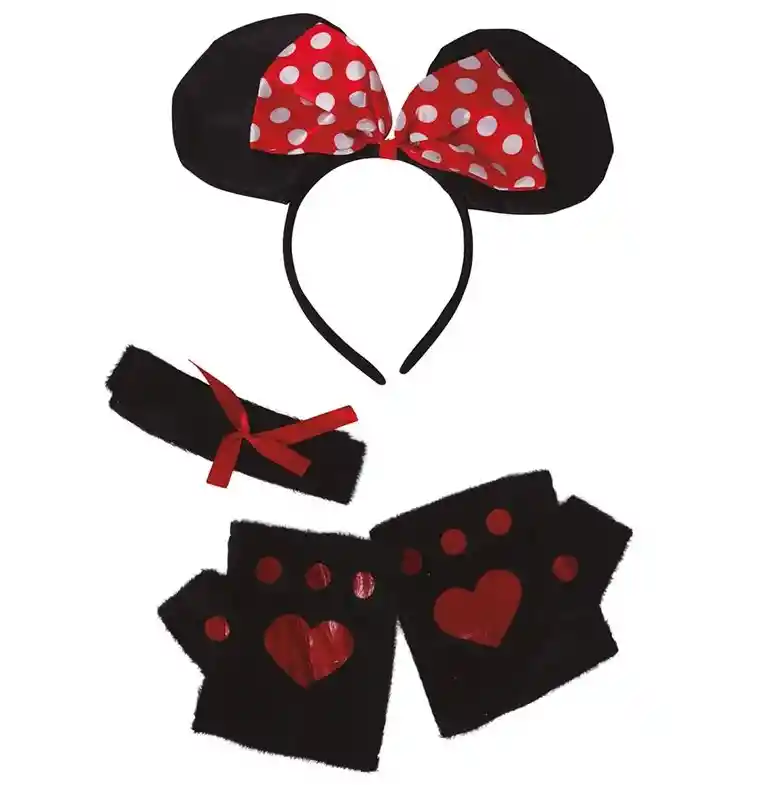 Kit de Ratoncita de 4 piezas. Set o conjunto de ratona para mujeres compuesto por diadema con orejas, gargantilla y 2 mitones (guantes).
