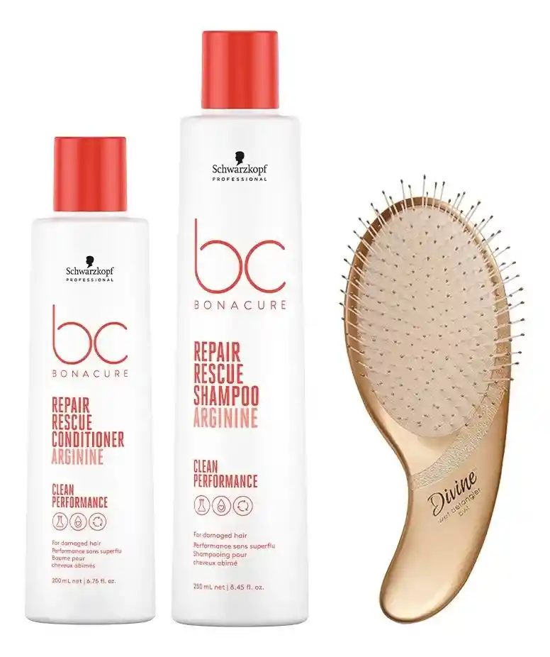 Schwarzkopf profesional diseño este kit de recuperación profesional, especialmente para ti. ¿Qué incluye este kit? Kit Repair Rescue incluye shampoo 250ml, acondicionador 200ml + Obsequio Peine OLIVIA GARDEN - Shampoo Repair Rescue: Encargado de limpiar suavemente el cabello y devolver la fuerza y elasticidad de la hebra capilar. -Acondicionador Repair Rescue: Encargado de desenredar y mejora la capacidad de peinado al mismo tiempo que suaviza y sella la superficie del cabello ¿Cómo se si este es mi kit ideal? - Sientes que tu cabello está literalmente DESTRUIDO -Te sometiste algún proceso químico (Decoloración, tintura) y sientes que tu pelo perdió la vida -Falta de brillo, sedosidad y vitalidad ¿Cuáles beneficios te brinda de este kit? -Revierte instantáneamente 3 años de daño -Hasta un 95 % menos de rotura del cabello * -Cuidas de tu cabello al mismo tiempo que cuidas del medio ambiente *Obsequio Olivia Garden* Este exclusivo peine de Olivia Garden es el complemento perfecto para tu rutina de cuidado capilar. Con cerdas flexibles que se adaptan a cualquier tipo de cabello, este peine es capaz de desenredar el cabello sin esfuerzo, incluso cuando está mojado. Su diseño ligero y ergonómico lo hace fácil de llevar a cualquier lugar, asegurando comodidad y funcionalidad en todo momento. Además, previene el quiebre y el daño del cabello, garantizando un cuidado suave y efectivo. Recuerda que nuestros productos son libres de sulfatos y siliconas. Atrévete a darle a tu cabello el cuidado que merece al lado de los mejores productos Somos La Tienda Oficial de Schwarzkopf Profesional, compra tranquilo y seguro