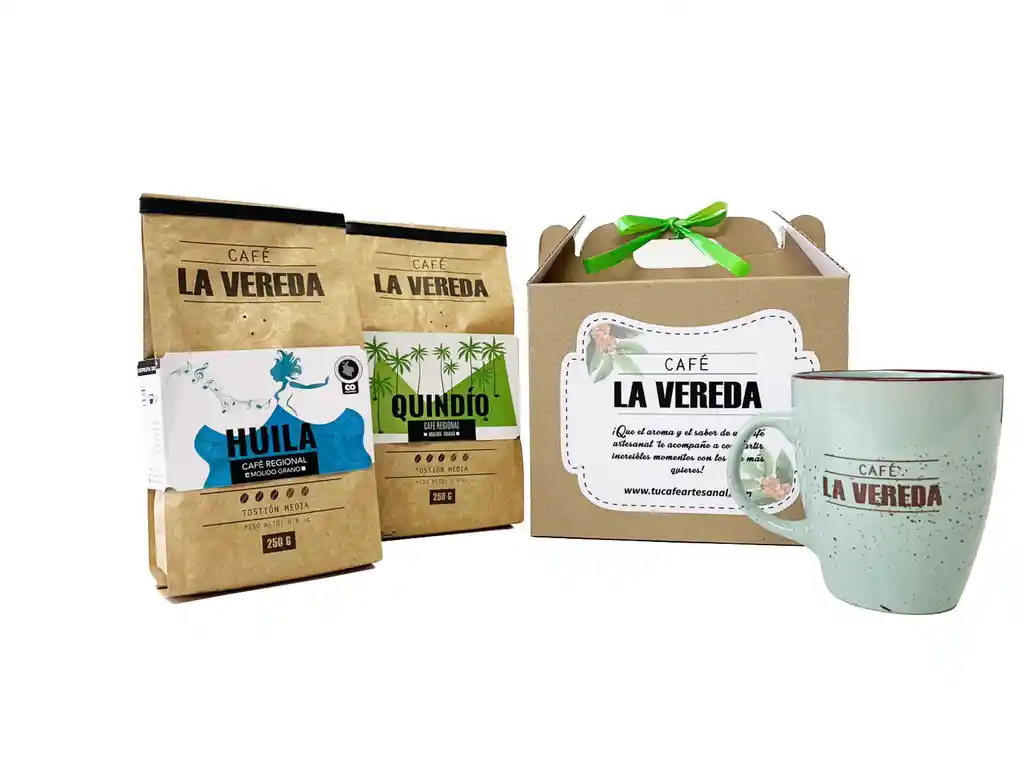 Kit de Regalo Box Café La Vereda + Mug. Contiene 2 bolsas de Café Vereda x 250 gr c/u : Huila -Quindío + Mug 12 oz en caja de cartón. En Grano